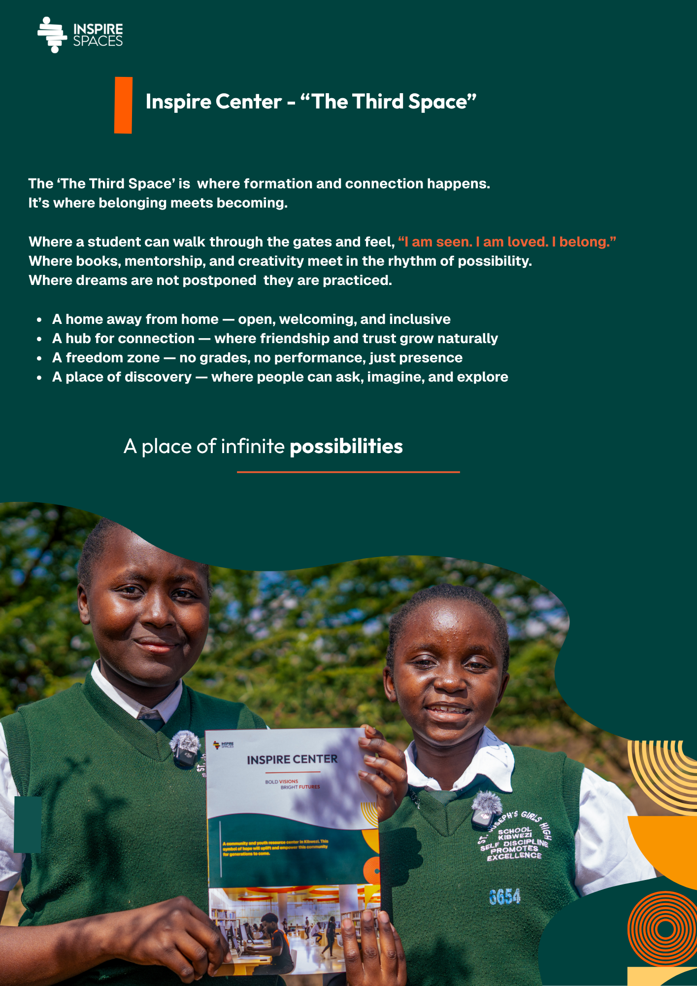The Inspire Center is a visionary youth development hub rising in Kibwezi, Kenya. A Third Space where learning meets belonging, and where young people are equipped to lead, create, and thrive. Designed as a place between home and school to serve as the heartbeat of Inspire Spaces’ mission to see every young person seen, heard, known, and loved. Here, education, mentorship, and innovation converge to form a new generation of courageous, compassionate leaders who will shape the future of their communities and the world.